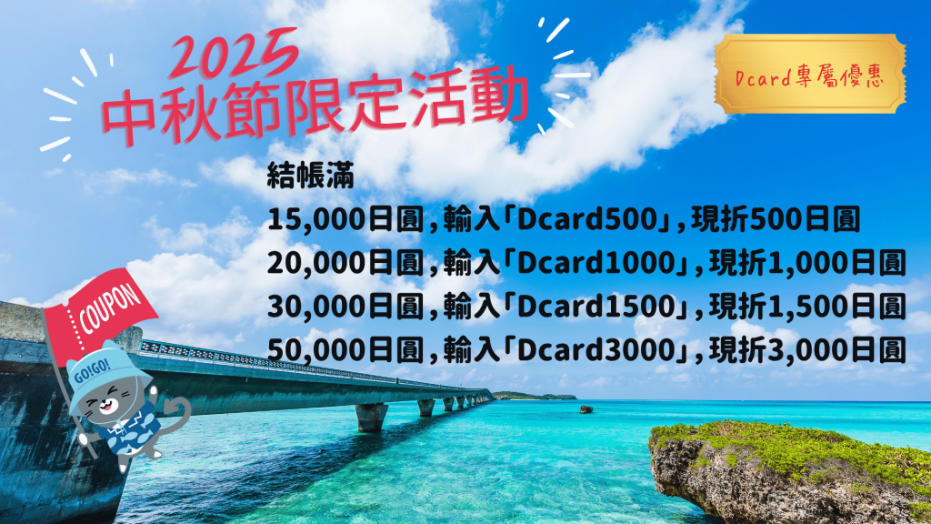 即日起至2025年10月31日止,下單結帳時滿額輸入「Dcard500」、「Dcard1000」、「Dcard1500」、「Dcard3000」,可享限時優惠!快點以下網址在日本暢遊自駕吧!