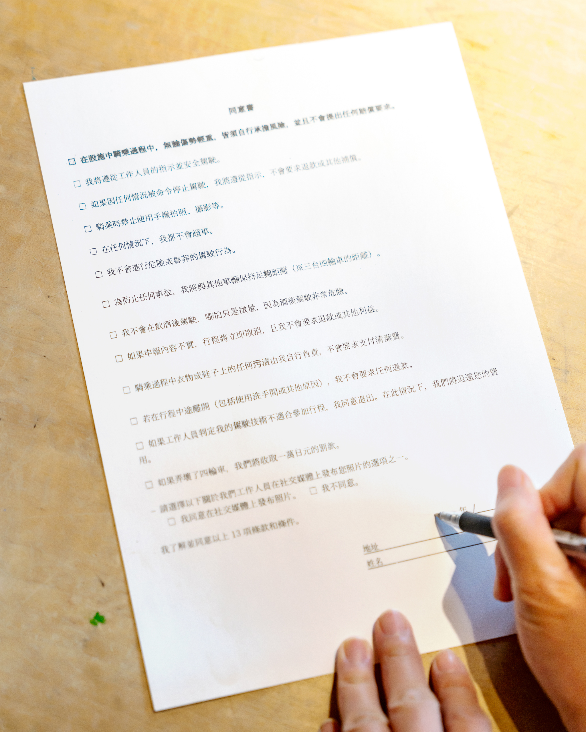 到集合處簽署同意書,店家本身雖然是以日文及英文溝通,但有準備中文版同意書,非常貼心。