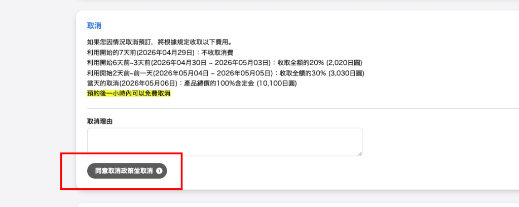 4.確認取消手續費後點擊“同意取消政策並取消”